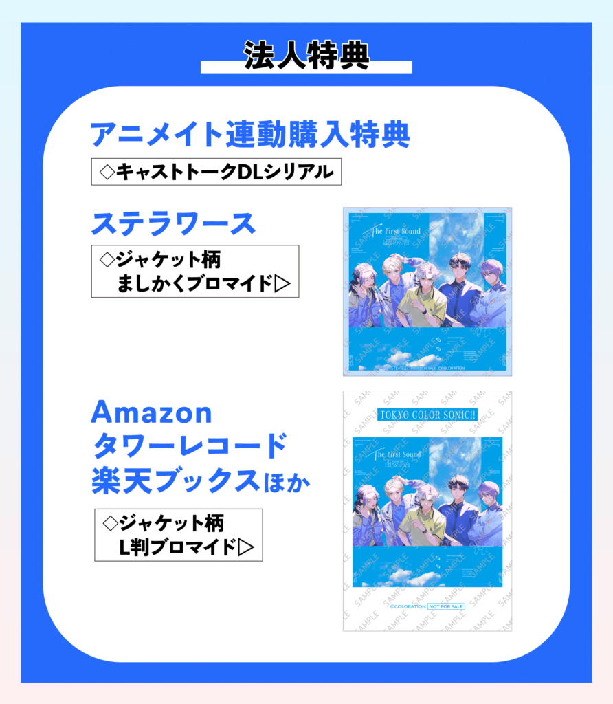 ジャケット:冨士原良描きおろし ◆セット内容 <ドラマ「はじめの音」Ep.01~25、「録り下ろし音源:近況ボイス(作詞作曲メンバー)」 ダウンロードシリアルコード> ※ドラマのダウンロード・再生にはクラブアニメイトの会員登録・ポケットドラマCDアプリのインストールが必要です。(ともに無料) ※シリアルコード入力期限:2031年12月31日(水)23:59まで <リーフレット 1部> 素材:紙 <ましかくブロマイド5枚セット(ボーカルメンバー)> 素材:紙 【アニメイト連動購入特典】 キャストトークダウンロードシリアル Vol.1・Vol.2を各店舗で両方ご購入いただいた方に特典シリアルをプレゼント ※キャストトークのダウンロード・再生にはクラブアニメイトの会員登録・ポケットドラマCDアプリのインストールが必要です。(ともに無料) ※シリアルコード入力期限:2026年6月30日(火) 23:59まで 【ステラワース】 ジャケット柄ましかくブロマイド 【Amazon、タワーレコード、楽天ブックスほか】 ジャケット柄L判ブロマイド